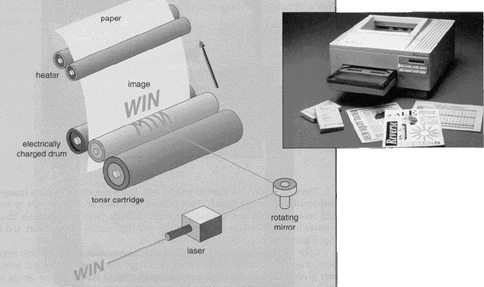 A Laser printer uses a laser beam to print. The laser creates an image on a drum inside the printer. This picks up toner and prints the image on to the paper like a photocopier does.