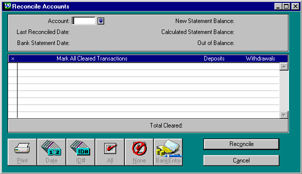 Account: Press TAB to bring up a list of all your accounts. Select the account to be reconciled by clicking on it (the account will be highlighted). Click on Use Account .