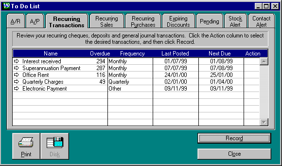 A positive number in the Overdue column means the transaction is over due, a negative number means it is not due yet.Click on the arrow next to the transaction to display the original journal entry. Click on Record or OK to record this recurring transaction.