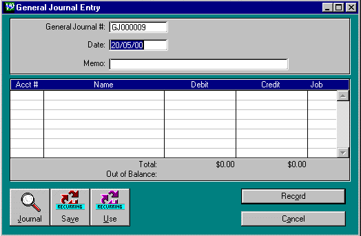 Debit and Credit : You must put a dollar amount into ONE of these fields for each line of your General Journal Entry. You can not enter a negative amount (as a negative debit is a credit and vice versa). Put the amount of the transaction into the Debit field if you are debiting the account you have just selected. Put the amount into the Credit field if you are crediting this account. You can debit and/or credit more than one account for this transaction if you wish. However, each debit to an account must go on a new line, and similarly for credits. The same account can be used on more than one line if you wish. The total of the debit amounts must equal the total of the credit amounts. Any discrepancy between the two will be shown next to the Out of Balance : field above the buttons at the bottom of the screen.