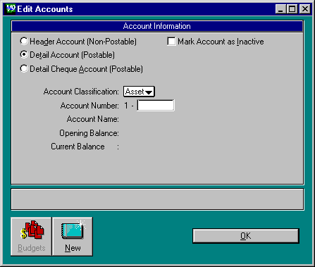 If the account you need to use is not on the list, highlight an account on the list of the type you need (Asset, Liability, Equity, Income or Expense) and click on the New button. Fill in the information for the account.