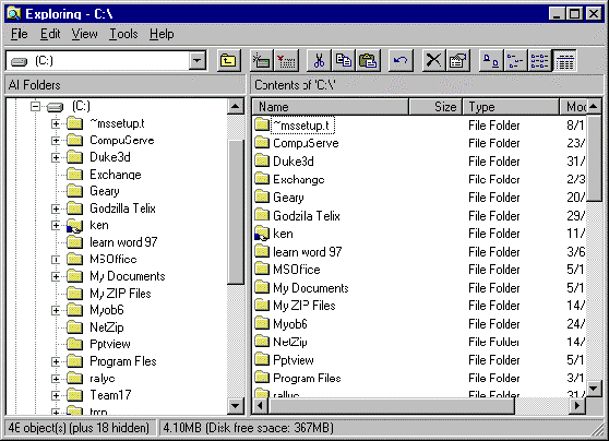 - At present the contents of the C drive are displayed in the Files pane. Scroll through this pane. You can see all the files and folders you saw when you opened the hard disk icon in My Computer.