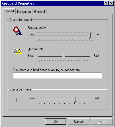 - Test the repeat rate by clicking in the box provided and holding down a letter key.