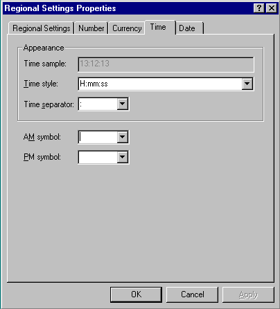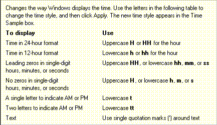 - Click on the ? button (top right of dialog box) and then on the words Time Style. A yellow box will appear showing all the different formats you can have your time in.