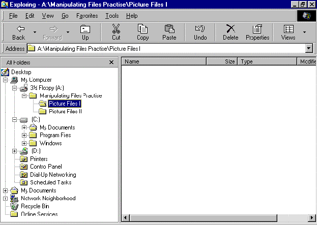- In the Folders pane, click on the folder name Picture Files I to open that folder in the Files pane. The Files pane should be blank, as below.