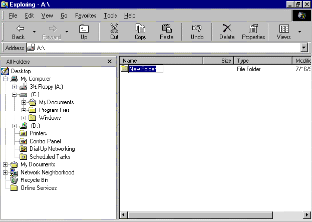 We will now create some folders for you to copy and move files into. Folders are Microsoft® Windows® 98 way of organising files. To create a folder, you must open the location you want the folder in the Files pane of Windows explorer. For example, to create a folder on the hard disk, you would click on the hard disk name (C) to display its contents in the Files pane. To create a folder in the Windows folder, you would click on the name Windows in the Folders pane so its contents are displayed in the Files pane. We are going to create our folders on the floppy disk you have just formatted.