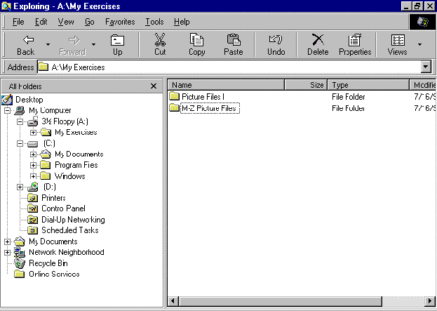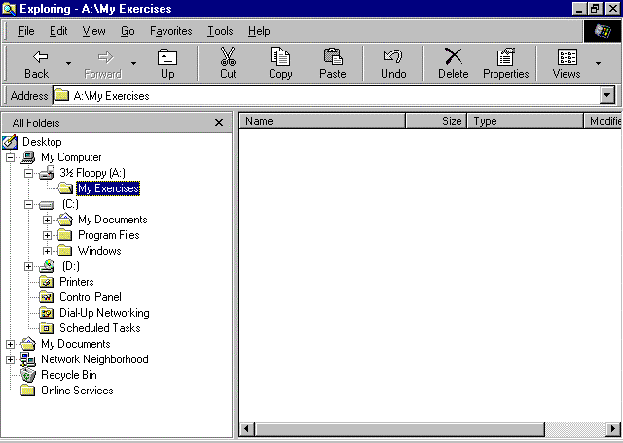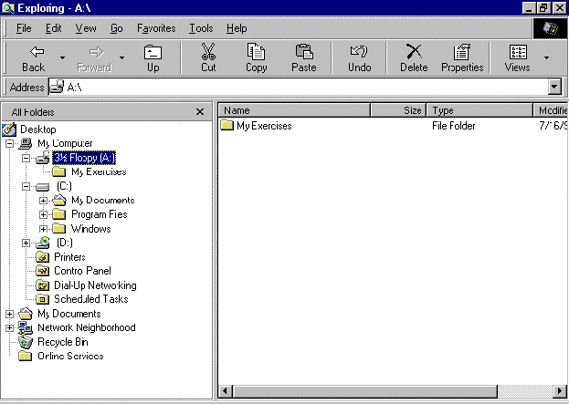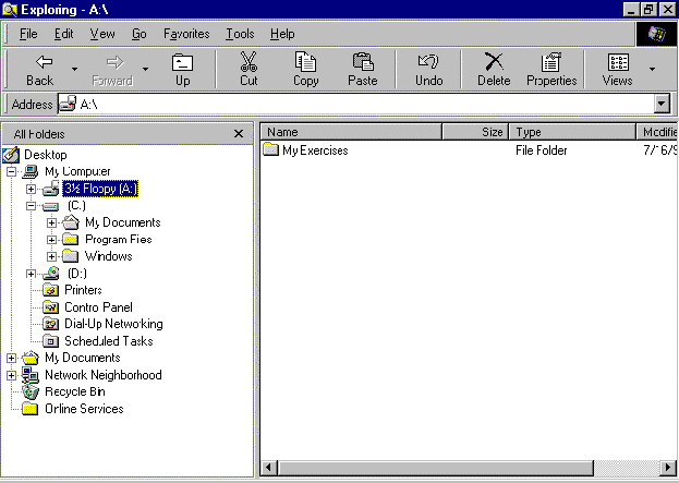 Notice that a plus sign has appeared next to the floppy disk drive icon in the Folders pane. Click on this plus sign to display the folder My Exercises in the Folders pane.