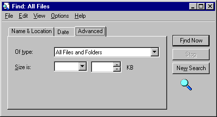 - This tab gives you three options. You can search for files that are of a certain type, and/or files that contain certain words, and/or files of a certain size.