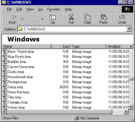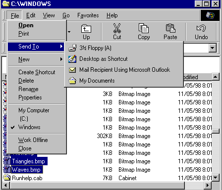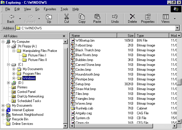 - Select the file(s) you want to move. We will move some of the Bitmap files. Click on Houndstooth.bmp, hold down the shift key, and click on Waves.bmp. All the selected files should be blue.
