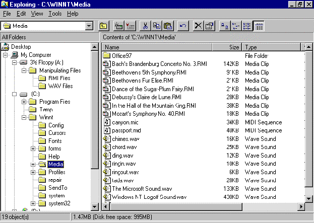 - Scroll up the Folders pane until you see the file WAV Files. Windows NT Explorer should look similar to that shown below.
