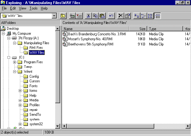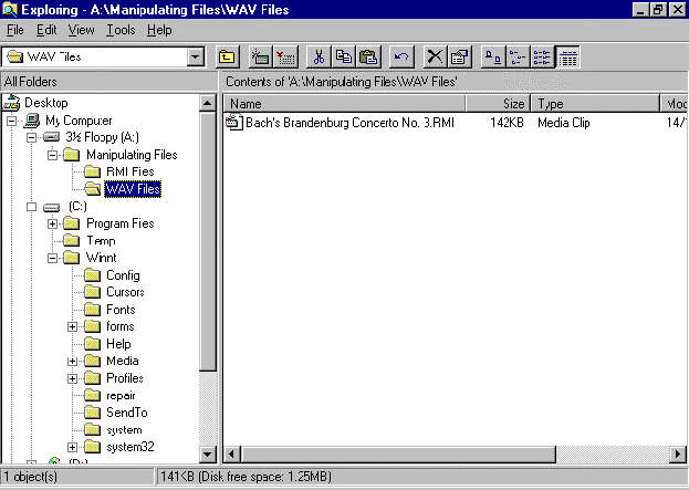 - In the Folders pane, click on the folder name WAV Files to open that folder in the Files pane. This should display the previously copied file, Bach's Brandenburg Concerto No. 3.RMI