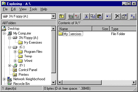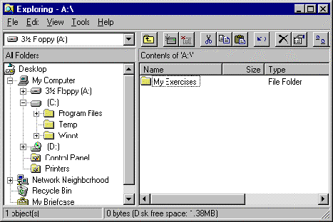 Notice that a plus sign has appeared next to the floppy disk drive icon in the Folders pane. Click on this plus sign to display the folder My Exercises in the Folders pane.