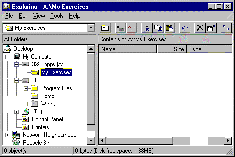 Click on the folder name My Exercises in the Folders pane to open the folder and display its contents (as yet nothing) in the Files pane.