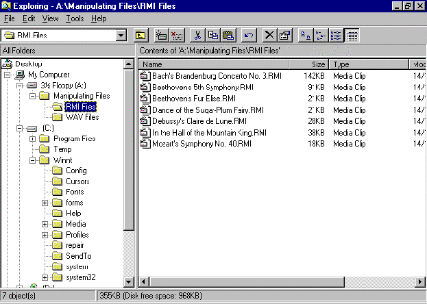 - Click on the folder name WAV Files in the Folders pane to display the contents of the folder in the Files pane. Note that the file Mozart's Symphony No 40.RMI is no longer present.
