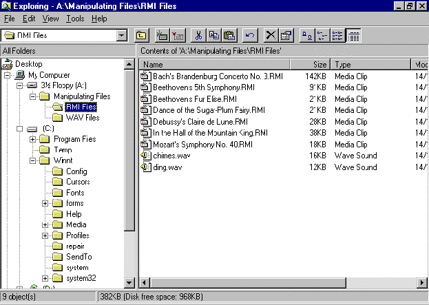 - Click on the folder name RMI Files in the Folders pane to display the contents of the folder in the Files pane. Note that the files Chimes.wav and Ding.wav are now present.