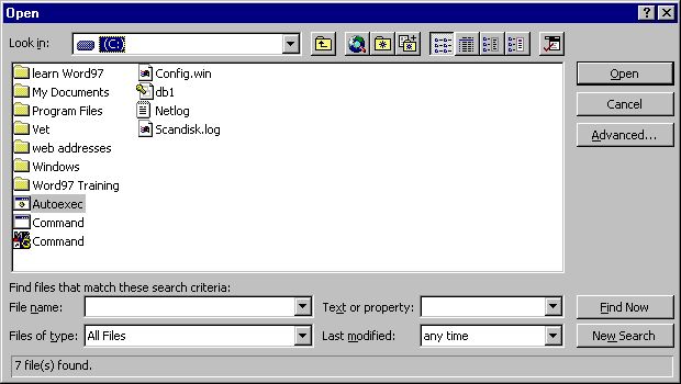 If your document is saved in another folder, you have to change the Look in field to this folder. We will change it to the folder Word97 Training on the C drive.